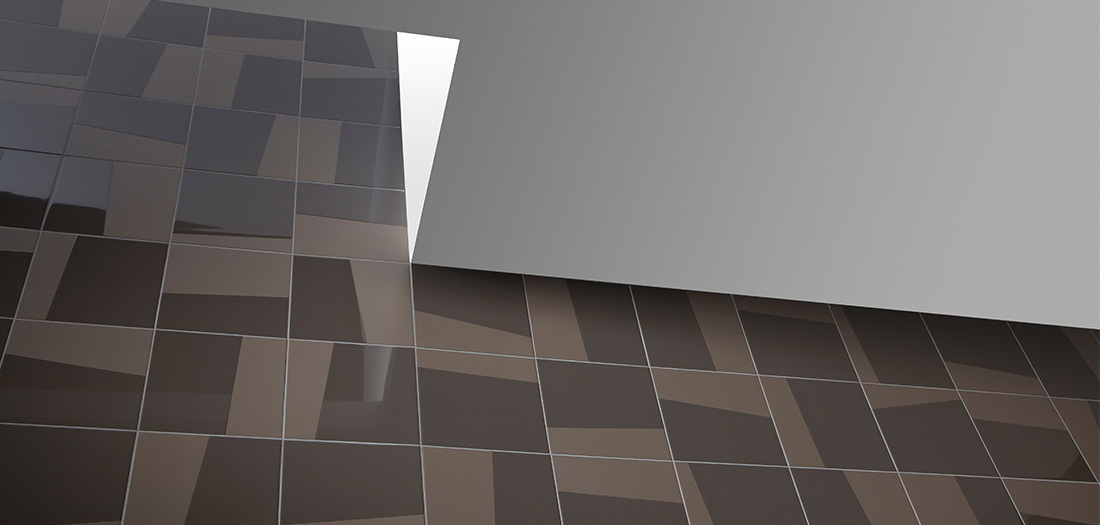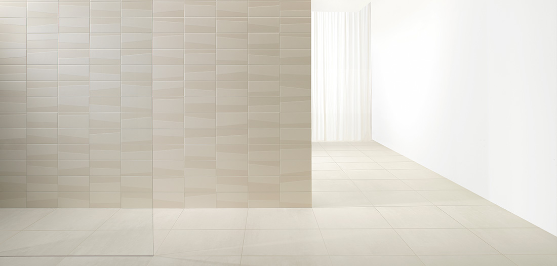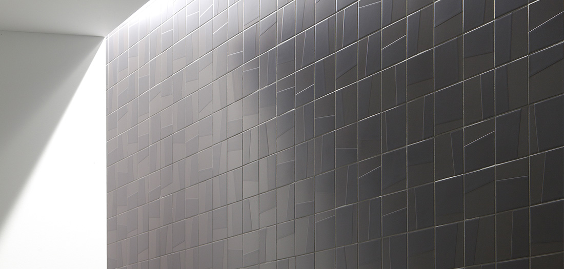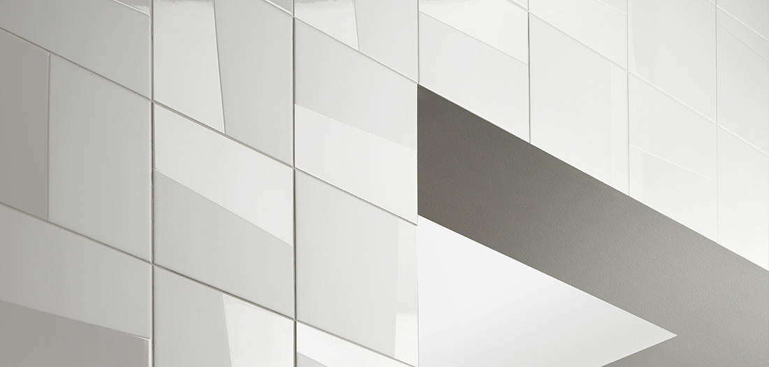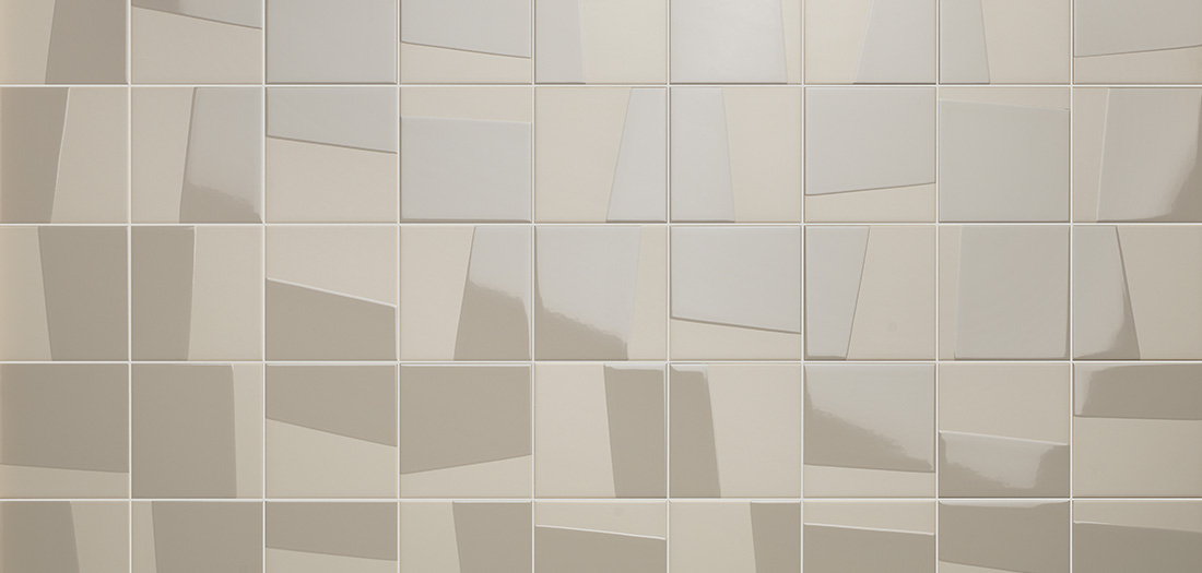 Subtle lines with random sweeps of glazing divides the tile into two parts. This creates a tile that catches light and plays with shadows. Murals Change consists of five colors: bright white, warm grey, earthy brown, anthracite, and clay beige. All tiles are available in the glazing combinations gloss/stone matt and stone matt/stone matt.