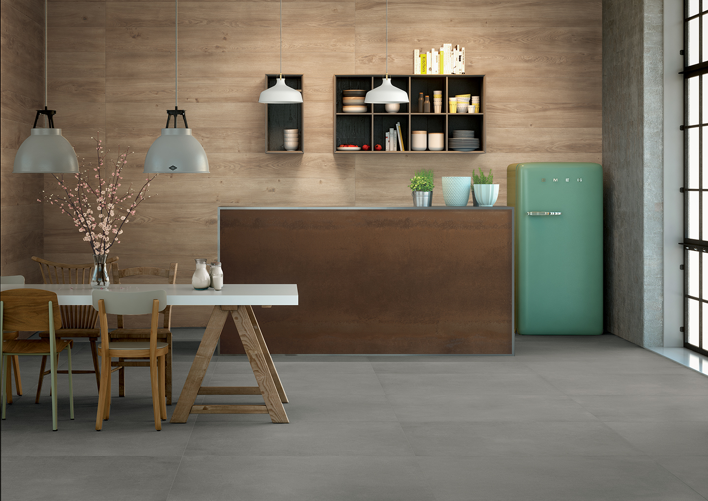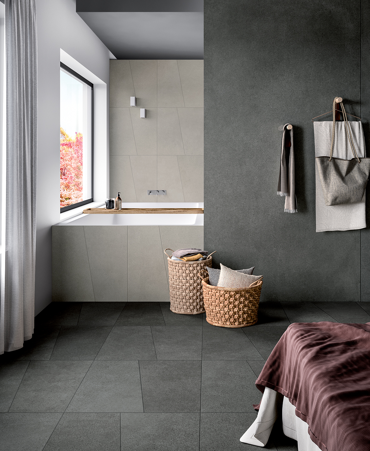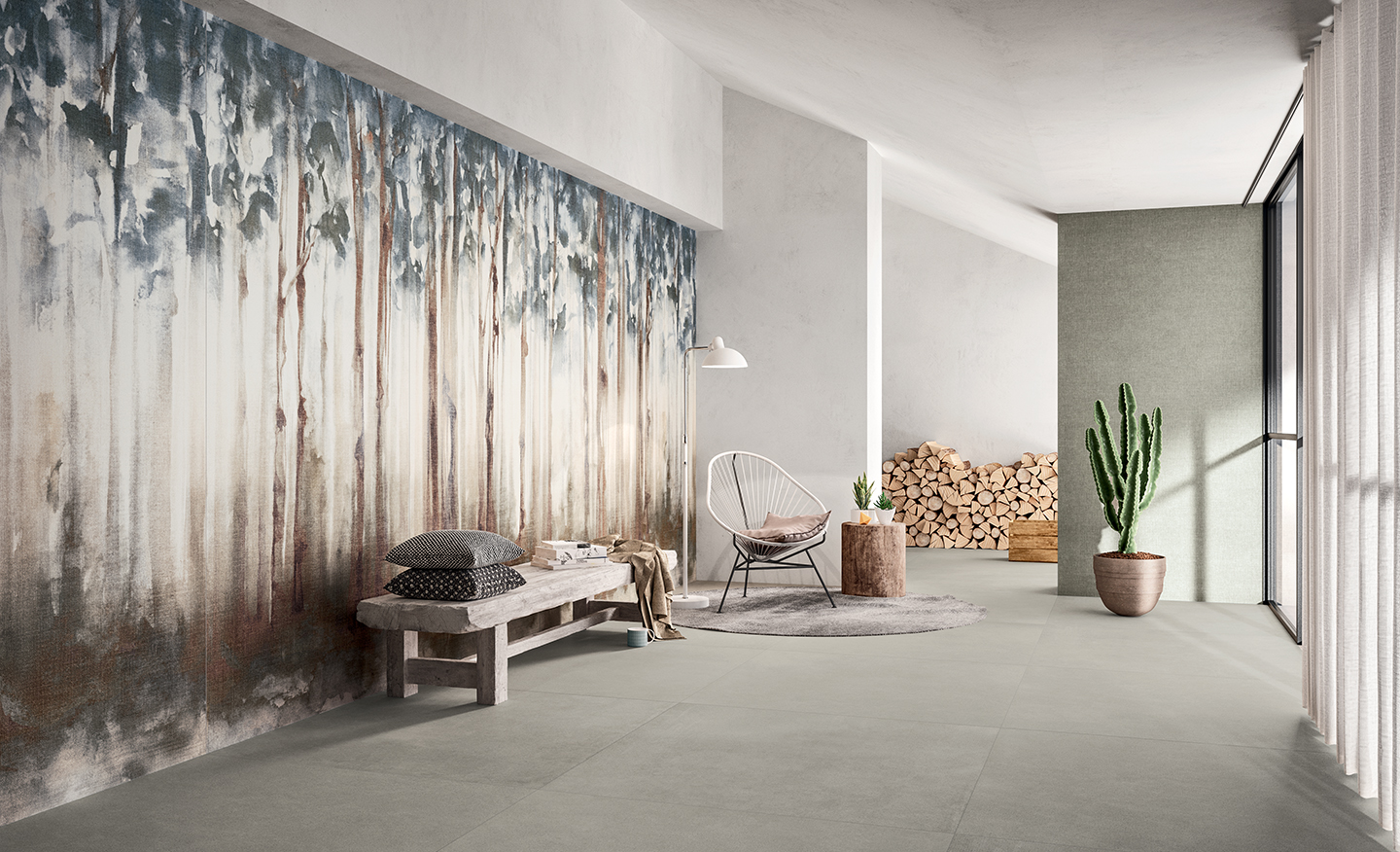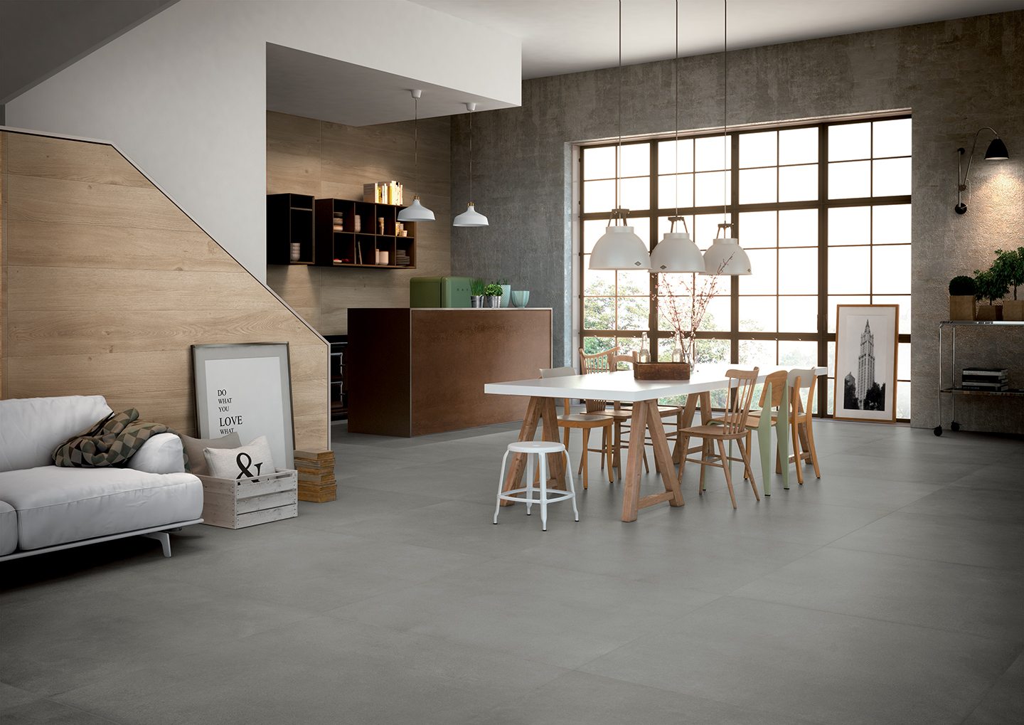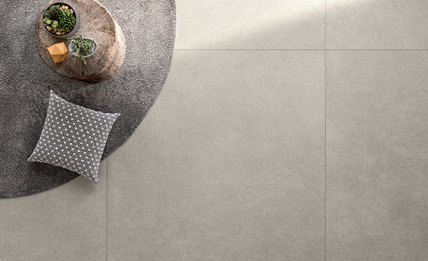 Available in four shades of gray with light detailing, the even texture of Freelab extends aver a 6.5 mm thick cement-based tile, expanding the sense of visual continuity and, with it, an ideaof creative freedom. Ideai for use in both public and private spaces. Freelab is ideai to pair with the Komi or Dream collections, especially for use as a neutral background that sets off the Woods décor: used together with the originaigeomertie motifs of the Match collection, it becomes another great toolfor artistic expression – and another examp le of the collection’s great design versatility.